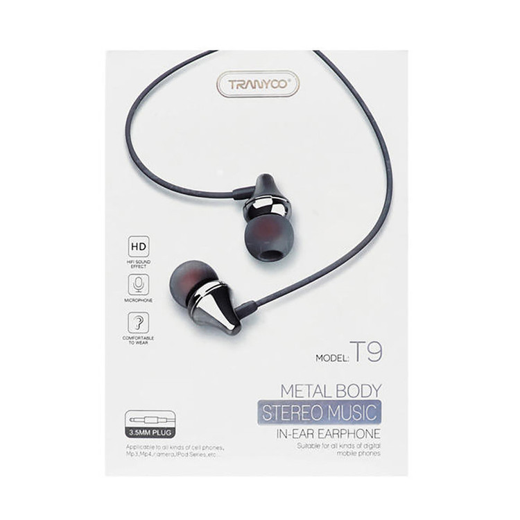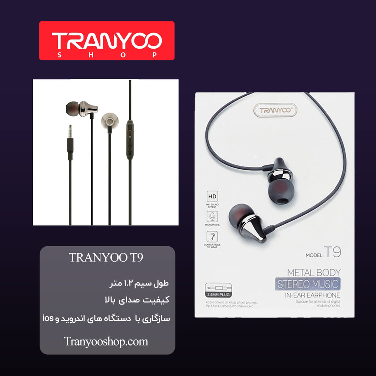 هندزفری سیمی ترانیو مدل T9 طول کابل ۱۲۰ سانتی متر اتصال با سیم از طریق رابط جک ۳٫۵ میلی متری صدا و طول کابل ۱۲۰ سانتی متر کلید فیزیکی مدیریت موسیقی و تماس و میکروفن HD جهت مکالمه ای شفاف و با کیفیت امپدانس ۳۲ اهم و فرکانس پاسخگویی ۱۸ هرتز الی ۲۰ کیلو هرتز حساسیت سیگنال به نویز ۱۱۶ دسی بل و قطر درایو ۱۰ میلی متر